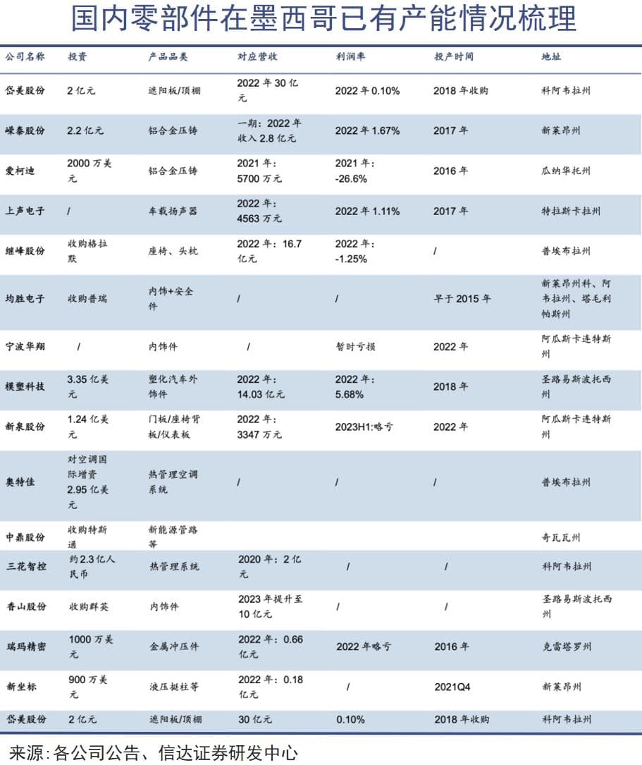 目前,汽车配件公司拓普集团墨西哥一期、二期基地已经投产;旭升集团墨西哥制造基地项目于去年开工奠基。早在2016年,爱柯迪就在墨西哥中部城市莱昂建成投产了第一个海外工厂,二期工厂计划明年二季度投产;文灿股份在2020年完成对百炼集团的收购,后者在墨西哥设有铸造机加工生产基地。