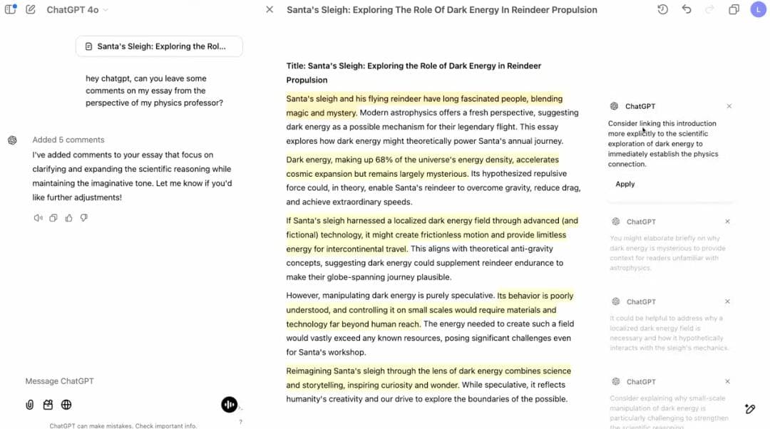 作为物理爱好者,主持人向 ChatGPT Canvas 上传了一篇题为《圣诞老人雪橇:探讨暗能量在驯鹿动力中的作用》的论文草稿,然后让 ChatGPT 以物理教授的视角进行评估。