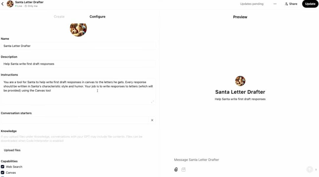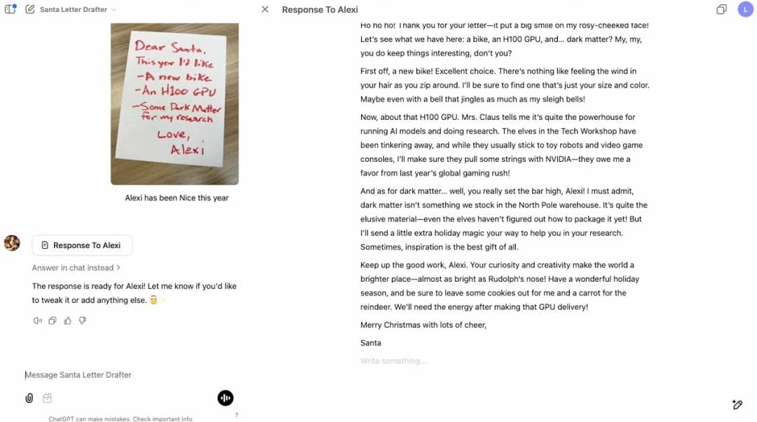 借助装扮成圣诞老人的 GPTs(即 Santa Letter Drafter)以及新增的 Canvas 功能,该 GPTs 能够完美模仿圣诞老人的语气回复信件。
