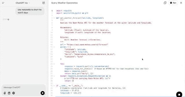 通过将代码复制并粘贴到 ChatGPT 中,它能够识别代码,并自动切换到代码编辑模式,帮助调试或查找错误。用户还可以直接在界面中运行代码,快速识别任何问题。