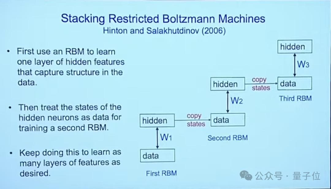 为构建特征检测器层可堆叠RBM,将前一个RBM隐藏单元活动模式当数据给下一个RBM,以此捕捉复杂相关性学习多组权重,堆叠后视为前馈网络可进行监督学习,这样初始化网络学习更快。因为网络已学习了数据结构,后面用于学事物名称相对容易,如识别物体方面。