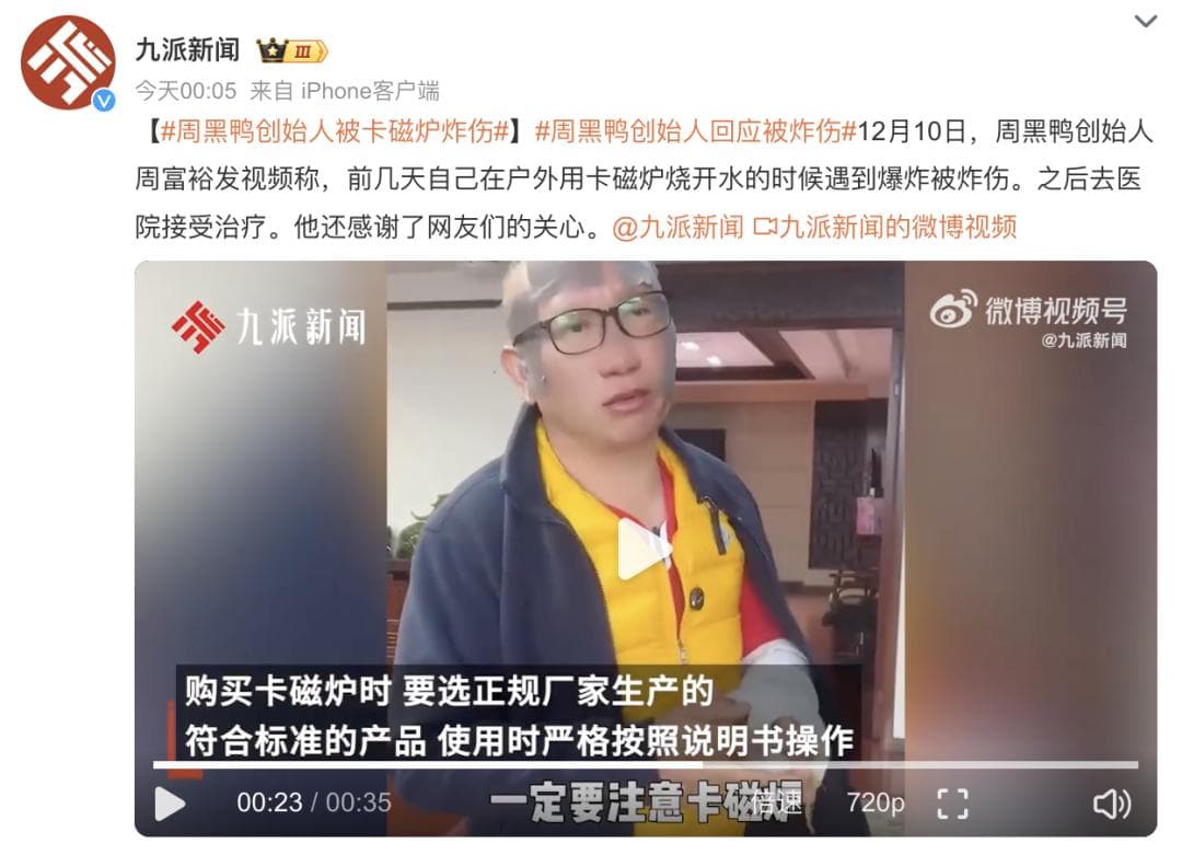 据@九派新闻 称,12月10日,周黑鸭创始人周富裕自曝自己前几天在户外用卡式炉烧开水的时候遇到爆炸被炸伤。