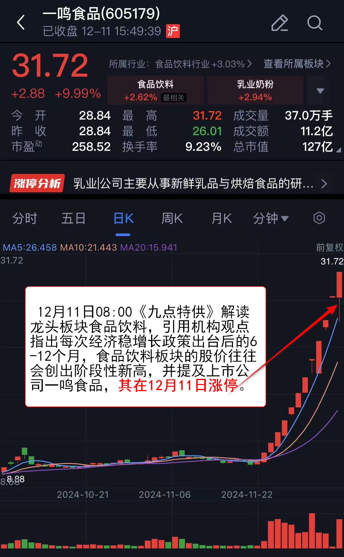,引用机构观点指出每次经济稳增长政策出台后的6-12个月,食品饮料板块的股价往往会创出阶段性新高,并提及上市公司一鸣食品,其在12月11日涨停。