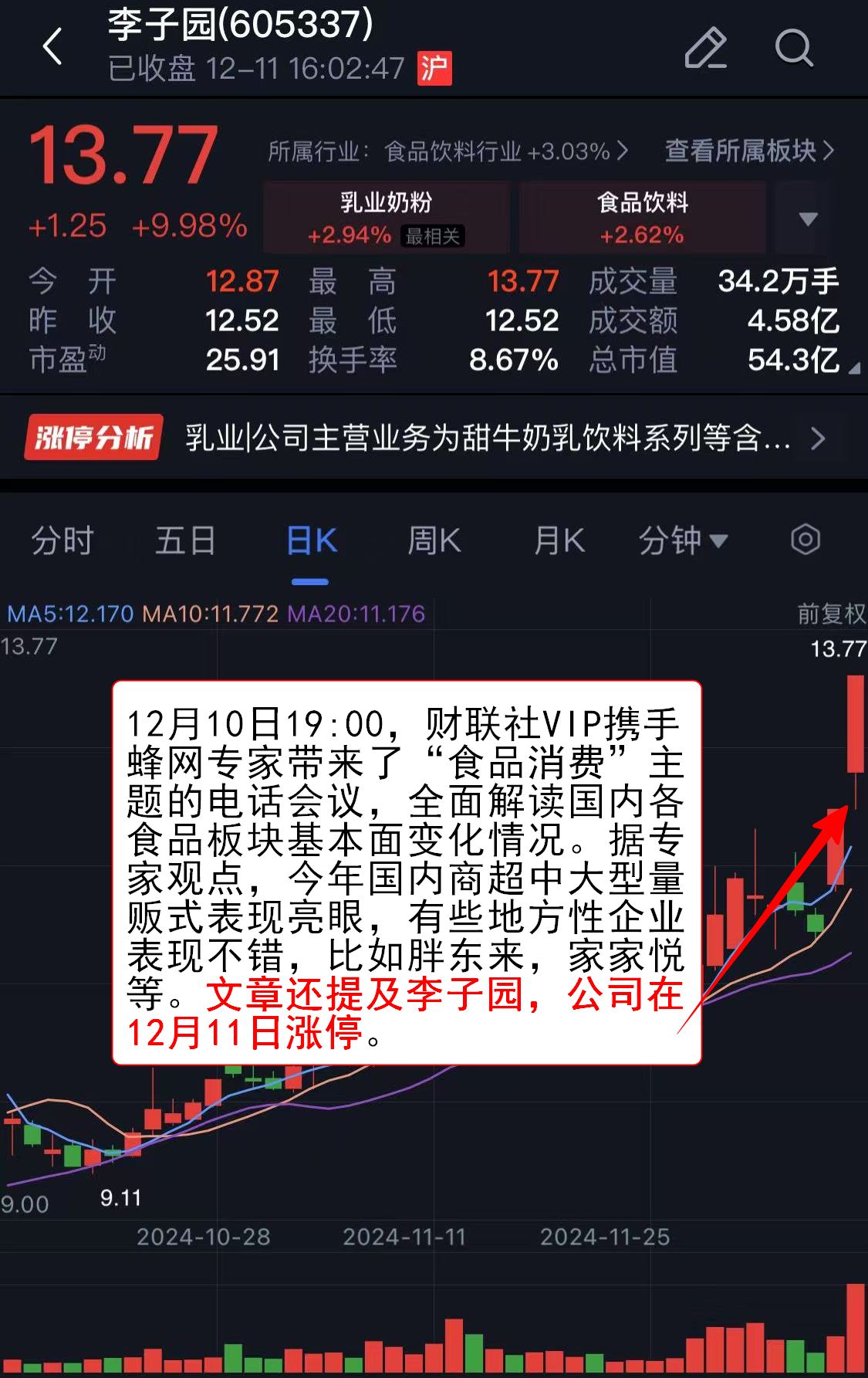 12月10日19:00,财联社VIP携手蜂网专家带来了“食品消费”主题的电话会议,全面解读国内各食品板块基本面变化情况。据专家观点,今年国内商超中大型量贩式表现亮眼,有些地方性企业表现不错,比如胖东来,家家悦等。文章还提及李子园,公司在12月11日涨停。