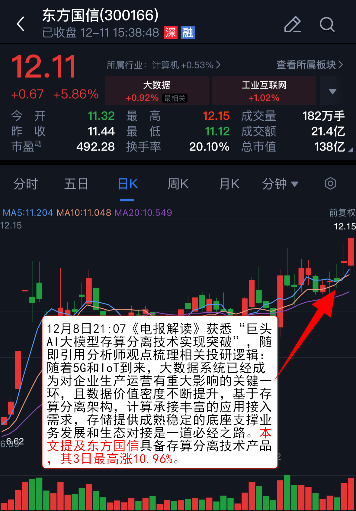 ,随即引用分析师观点梳理相关投研逻辑:随着5G和IoT到来,大数据系统已经成为对企业生产运营有重大影响的关键一环,且数据价值密度不断提升,基于存算分离架构,计算承接丰富的应用接入需求,存储提供成熟稳定的底座支撑业务发展和生态对接是一道必经之路。本文提及东方国信具备存算分离技术产品,其3日最高涨10.96%。