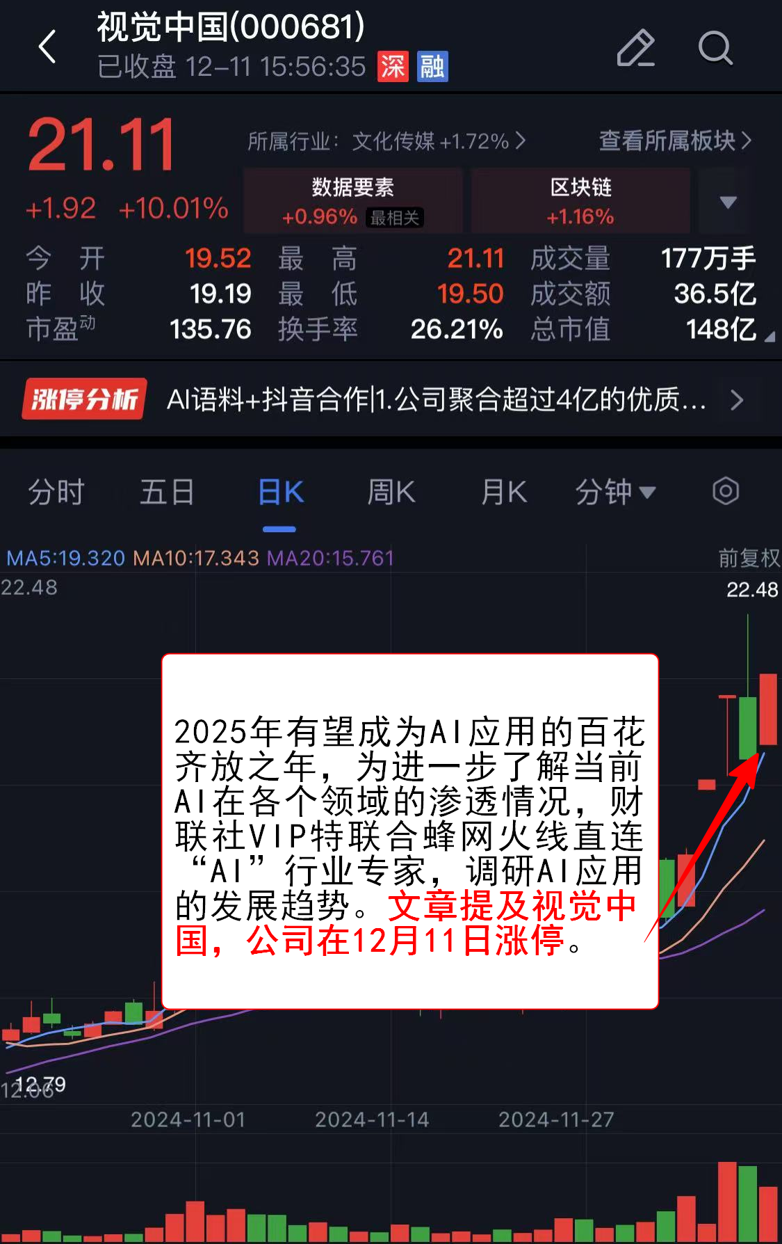 2025年有望成为AI应用的百花齐放之年,为进一步了解当前AI在各个领域的渗透情况,财联社VIP特联合蜂网火线直连“AI”行业专家,调研AI应用的发展趋势。文章提及视觉中国,公司在12月11日涨停。