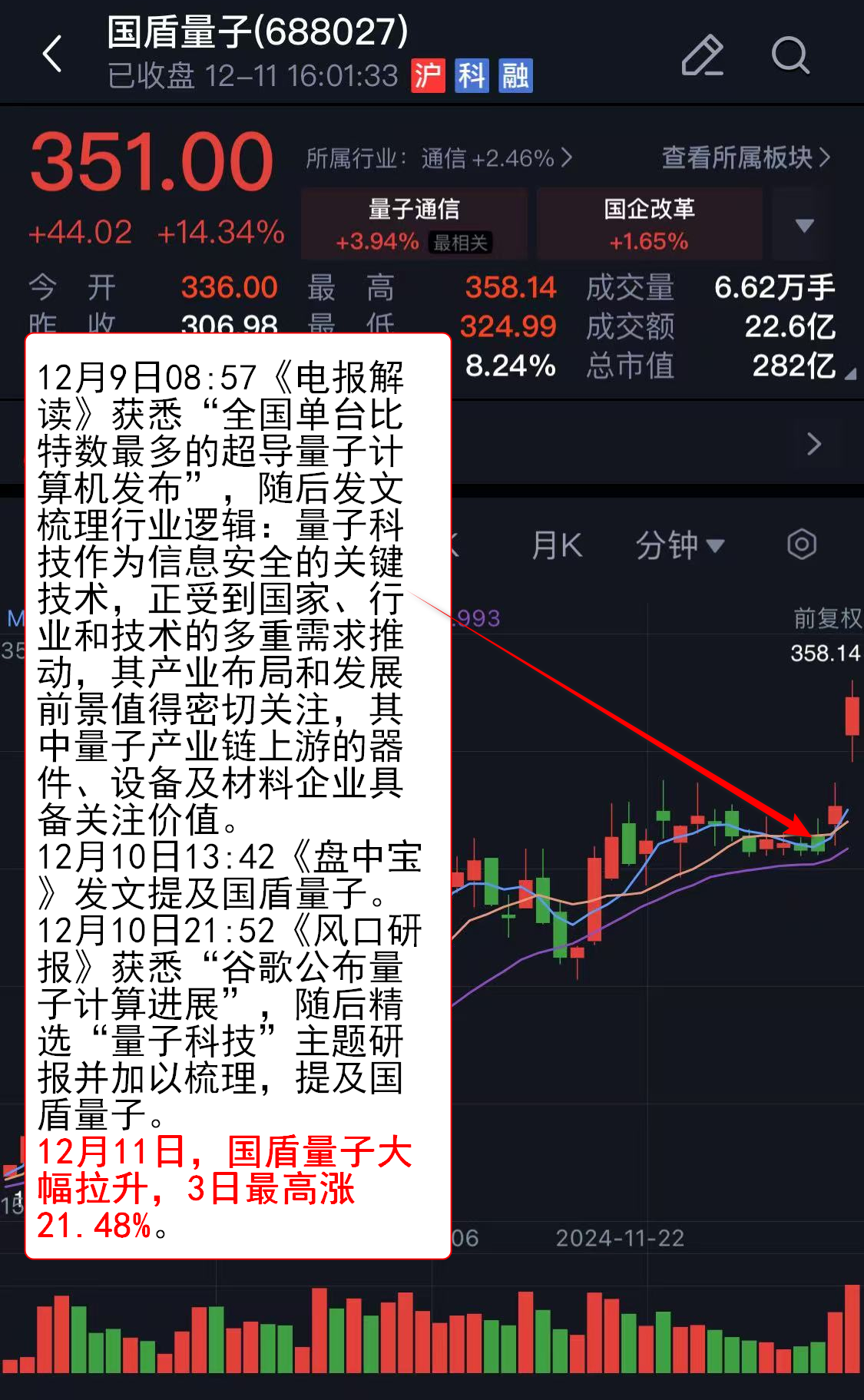 12月11日,国盾量子大幅拉升,3日最高涨21.48%。