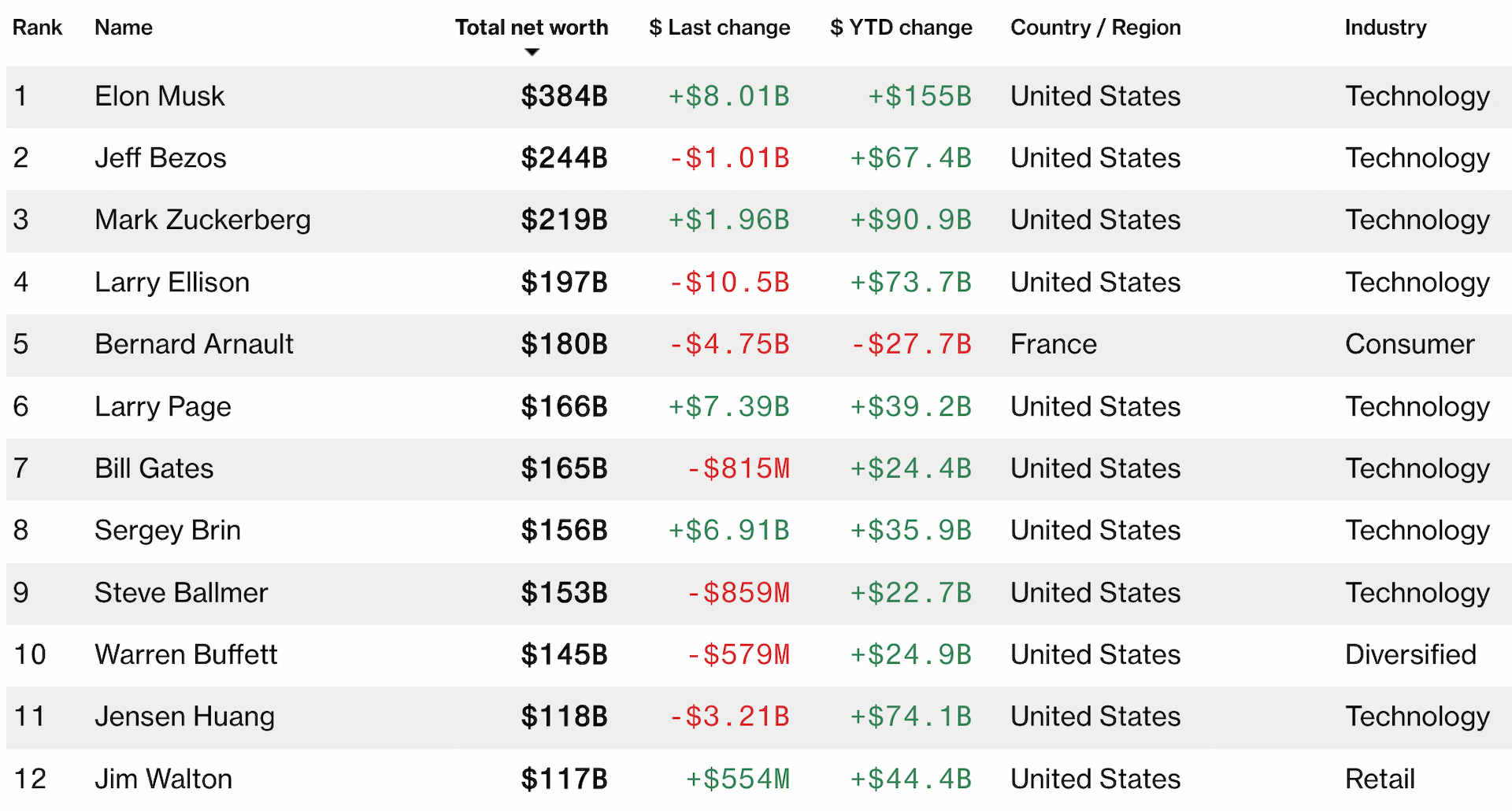 根据彭博亿万富翁指数,马斯克的财富已经达到了约3840亿美元,领先第二名、亚马逊老板贝索斯1400亿美元。而1400亿美元甚至可以位列全球第11大富豪,超过英伟达CEO黄仁勋。
