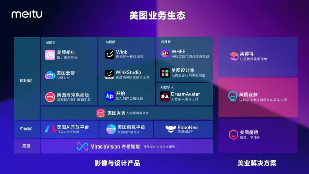 2023年,美图加大了在AI领域的投入。6月,美图发布了美图视觉大模型MiracleVision和六款AI产品——AI视觉创作工具WHEE、AI口播视频工具开拍、桌面端AI视频编辑工具WinkStudio、主打AI商业设计的美图设计室2.0、AI数字人生成工具DreamAvatar以及美图AI助手RoboNeo,覆盖了AI图片、AI视频、AI设计和AI数字人等多个领域。