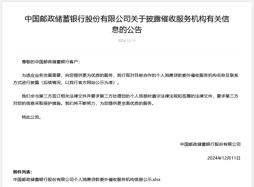 今日,邮储银行在官网发布了关于披露催收服务机构有关信息的公告。