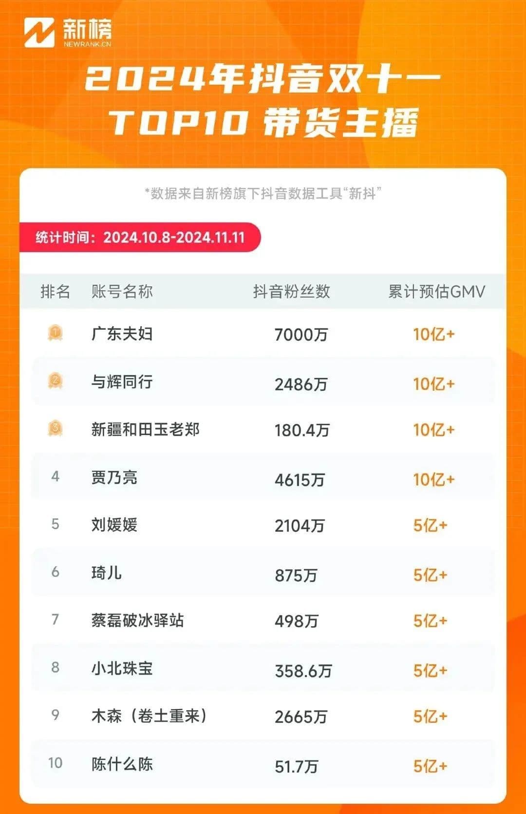 抖音今年双11同样没有黑马 ,广东夫妇、与辉同行占据榜单前列。