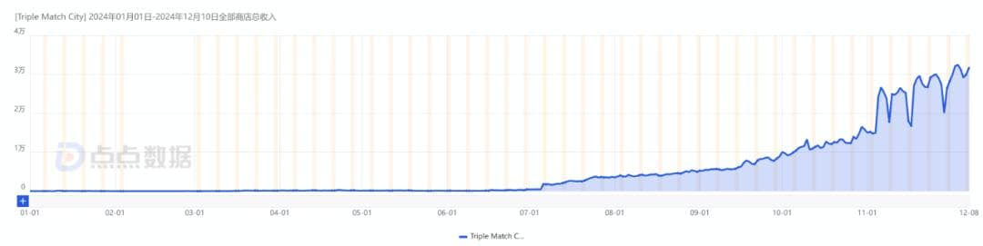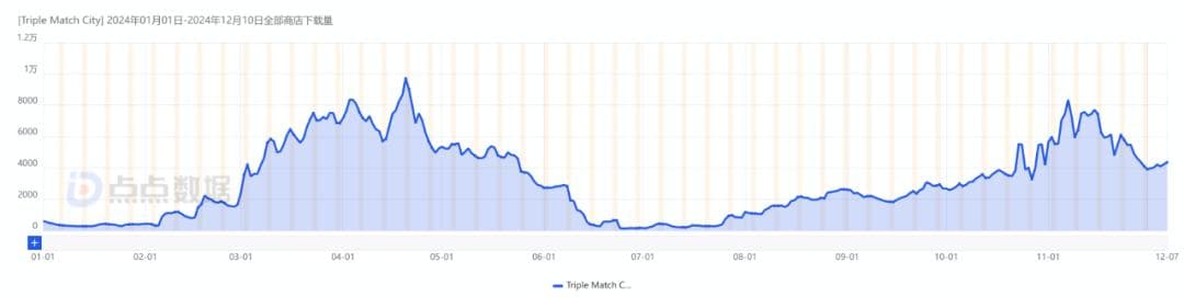 点点数据显示,《Triple Match City》在上半年时迎来过一波下载高峰,但这些安装量并没有转换成收入。在经过不断的产品调优和扩大买量规模后,游戏在11月以来再次获得更加集中的下载量爆发。目前游戏的总下载量已经超过100万次。