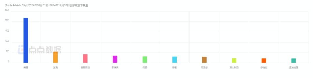 美国依然是《Triple Match City》在下载量上贡献最多的市场,占比达到19.93%。游戏在新兴市场的下载情况也相当不错,越南(4.96%)巴基斯坦(3.82%)菲律宾(3.16%)位列二到四位。