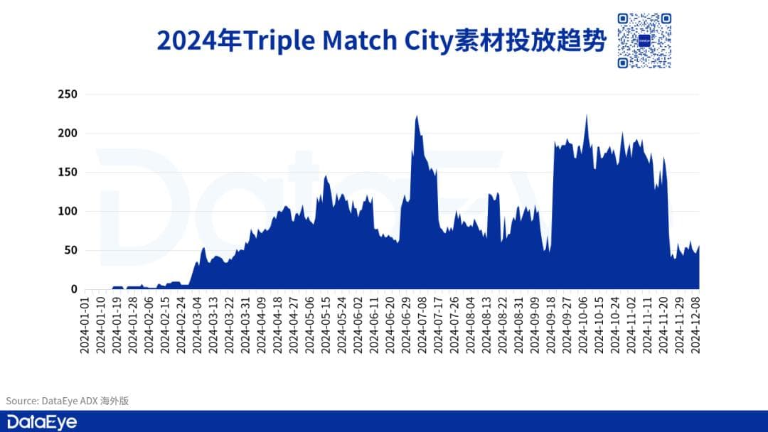 DataEye-ADX海外版数据显示,《Triple Match City》在今年上半年有过一波素材投放,之后大幅降低了投放力度。今年11月前后是游戏更加集中投放的阶段,日均消耗素材在150~200之间。