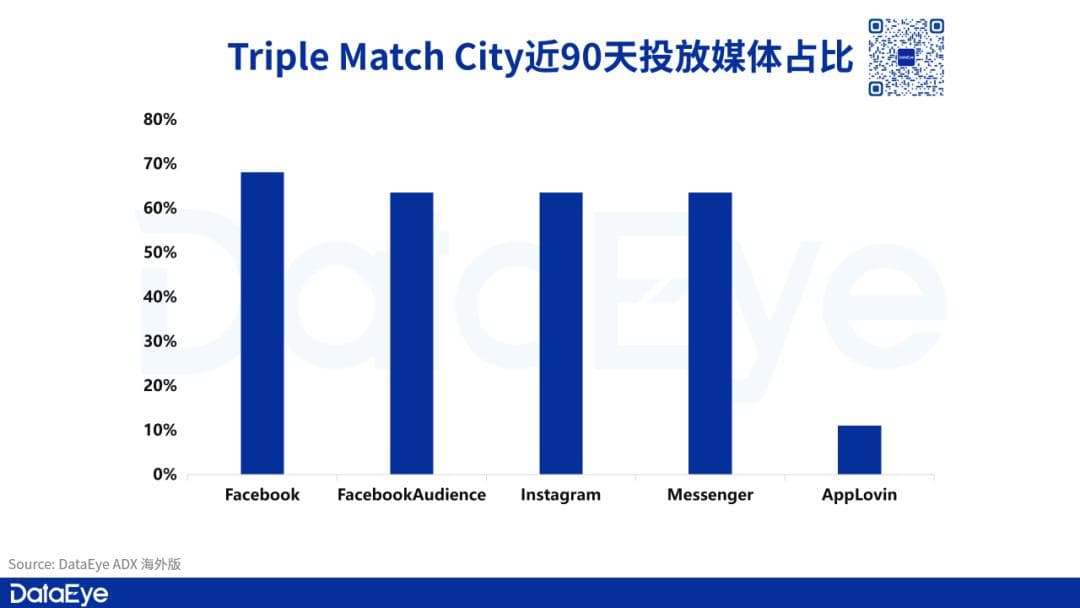 在近90天安卓端投放媒体的选择上,《Triple Match City》主投Meta系渠道。Facebook、FacebookAudience、Instagram、和Messenger均占比投放量的60%以上。