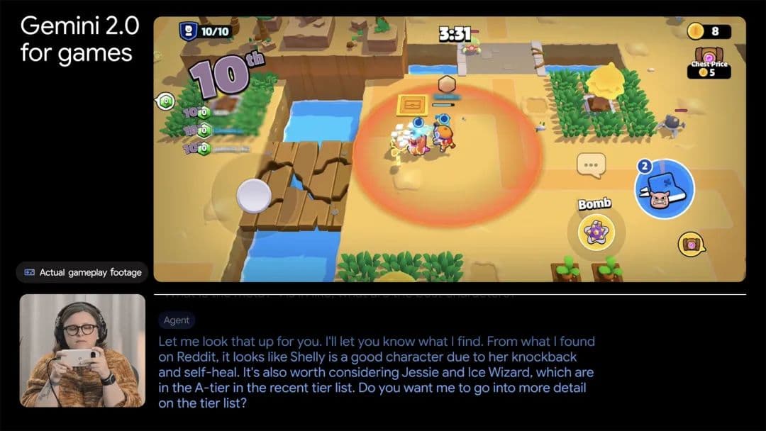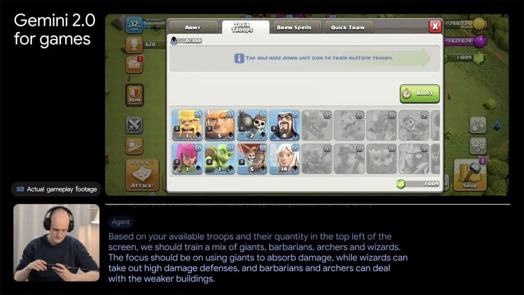 Google 还称,利用 Gemini 2.0 构建了一种“游戏助手”智能体,根据游戏进度实时分析战况、做出决策建议。他们正在同一些大型游戏开发商进行合作,目前测试中的知名游戏,比如《部落冲突》和《海岛奇兵》等。