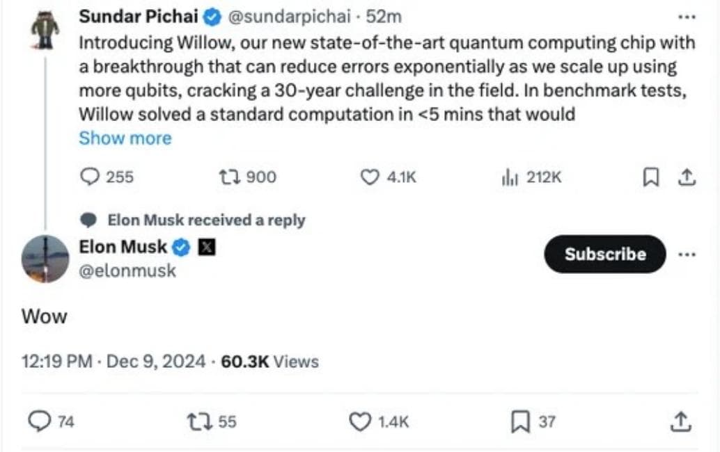 特斯拉首席执行官马斯克在社交网络上用一声惊叹“Wow”来回复谷歌首席执行官Sundar Pichai,随后,Pichai告诉马斯克,或许以后可以合作在太空中建立一个量子集群。