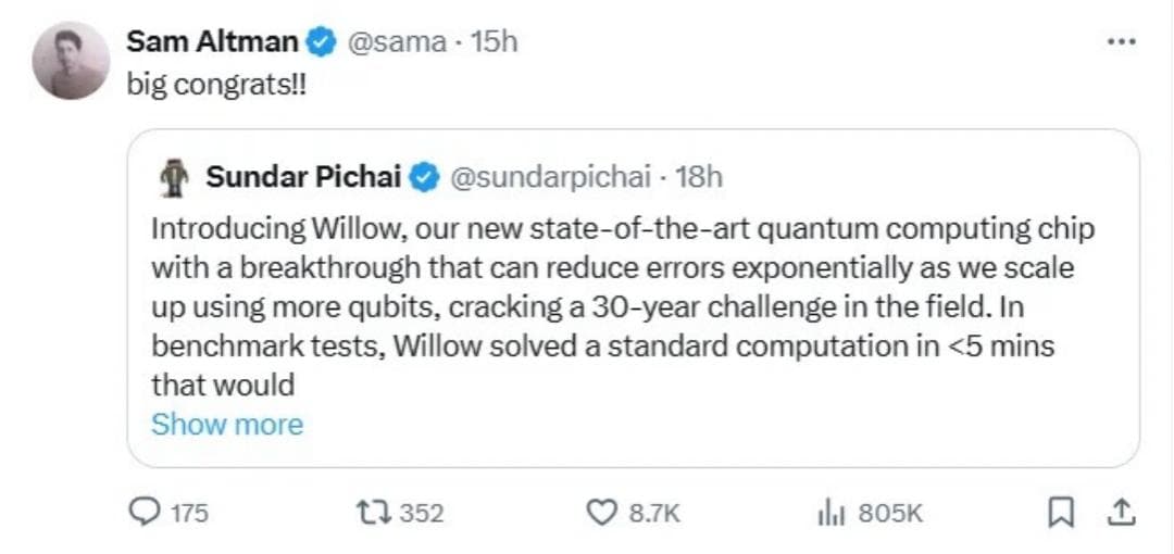 OpenAI首席执行官Sam Altman也转发了Pichai发布的内容并送上祝福。