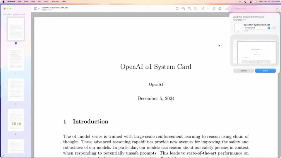 用户可以在几乎任何应用程序中唤醒Siri或写作工具。通过双击命令键,就能调出Siri提示框,而当Siri判断任务过于复杂时,系统会询问是否需要ChatGPT的协助,将难题移交给ChatGPT。