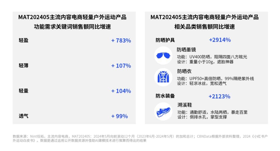 “轻”的概念正在从物理层面扩展到心理层面。消费者需要的是一种没有负担的愉悦感,从轻量运动到轻量生活,无一不在反映这一趋势。相比高门槛的专业运动,散步、慢跑、骑行等“微汗式”轻量锻炼逐渐成为主流。在产品选择上,消费者偏爱轻盈透气、防晒防水的户外装备,如防晒墨镜、防晒衣、溯溪鞋等轻户外用品的增速尤为明显。Citywalk和露营等潮流更是将轻运动带入了日常生活,成为疗愈和解压的方式,也在穿搭领域刮起了一股轻户外运动风。