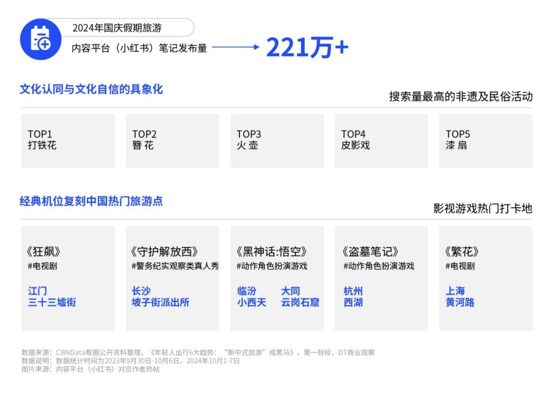 文化潮流的跨界也体现在沉浸式文化体验的爆发。从国潮服饰到《黑神话:悟空》所引发的古建游热潮,中国传统文化正以数字化和现代设计为载体,走入年轻人的生活。2024年国庆假期,小红书上与中式旅游相关笔记发布量高达221万+,《狂飙》、《守护解放西》、《黑神话:悟空》、《盗墓笔记》、《繁花》的拍摄地都成为热门打卡地。越来越多人通过文化旅游,领略中华文化的历史韵味与创新表达,甚至主动为传统文化“打call”。
