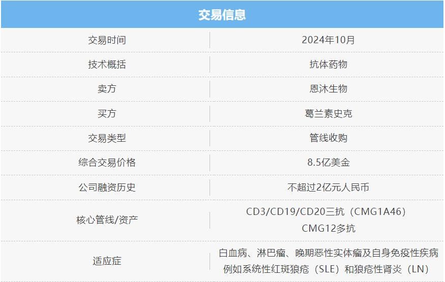 此前,买方葛兰素史克(GSK)擅长的疾病领域为系统性红斑狼疮。此次交易的原因是GSK在未来的战略布局中将着重开发以系统性红斑狼疮(SLE)和狼疮性肾炎(LN)为代表的自免疾病适应症,并在2025年开展红斑狼疮I期临床试验。买方葛兰素史克看中的是恩沐生物旗下创新药CMG1A46——对于治疗系统性红斑狼疮有着巨大潜力。在完成对CMG1A46的收购之后,GSK将重点开发以系统性红斑狼疮(SLE)和狼疮性肾炎(LN)为代表的自免疾病适应症。CMG1A46目前正在美国和中国进行白血病和淋巴瘤的I期临床试验。GSK计划在2025年开启该药治疗狼疮的I期临床试验。