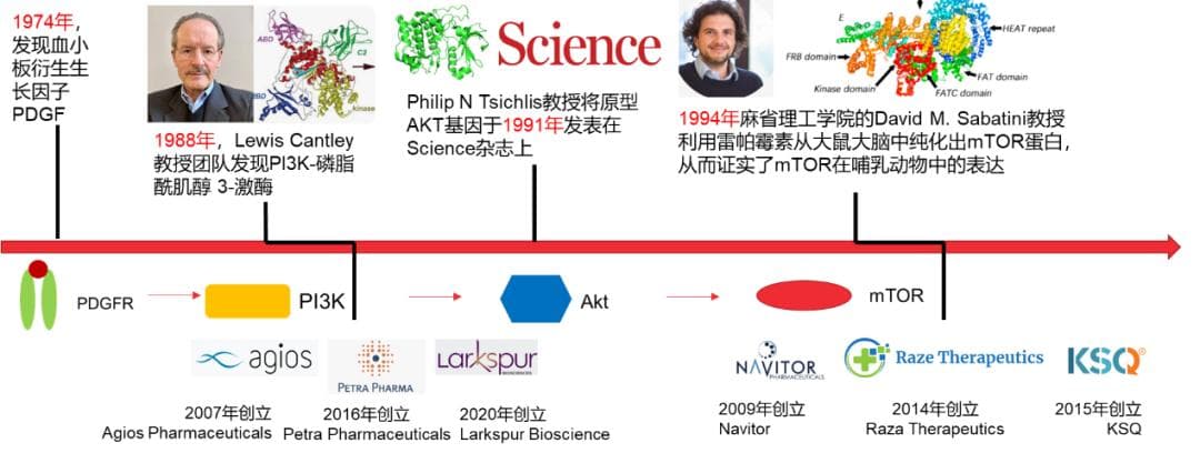 1988年,哈佛大学Lewis Cantley教授团队发现磷脂酰肌醇 3-激酶PI3K,作为PI3K-Akt-mTOR信号通路中游的关键分子。Dr. Cantley教授分别于2007年、2016年、2020年分别创立了Agios Pharmaceuticals、Petra Pharmaceuticals、Larkspur Bioscience三家公司。代表的上市药物有Gilead Science公司开发的一种首创的高度选择性、口服有效的磷酸肌醇3-激酶PI3K-delta抑制剂,于2014年7月23日获美国FDA批准。
