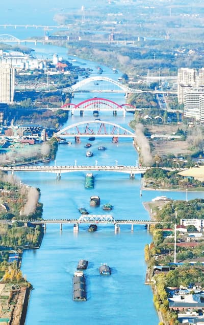 京杭大运河江苏扬州段,货船在航行。