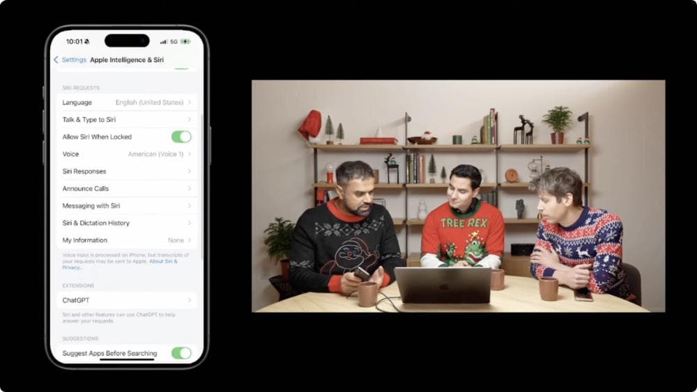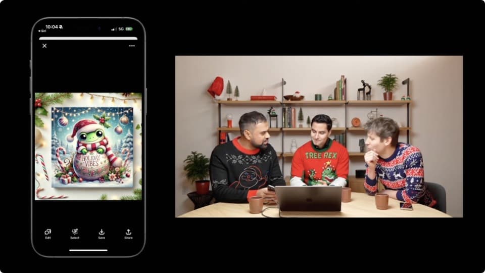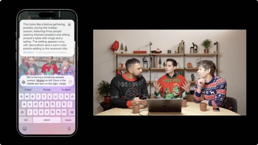 这场发布会最引人注目的环节,就是ChatGPT为苹果设备带来的视觉智能能力。OpenAI团队用一场即兴的"圣诞毛衣大赛"来演示了这项技术。