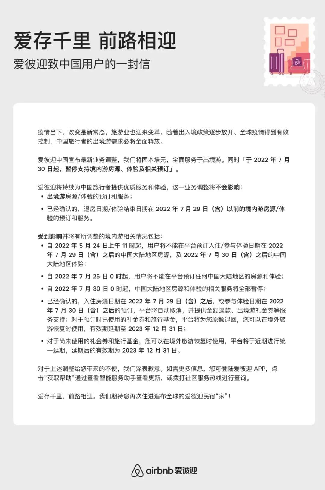 最终在2022年5月底,爱彼迎发布了感谢信:实在是赚不到人民币啊老铁,7月30日,我就撤了。