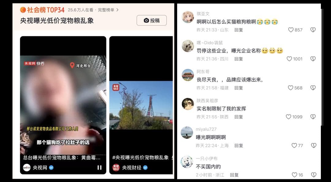 抖音上有个热点:央视曝光低价宠物粮乱象。
