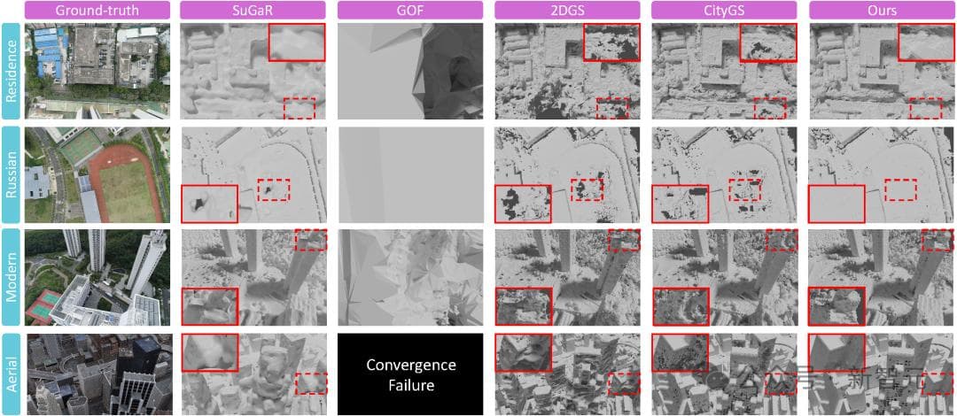 从不同算法在大规模场景下的几何重建效果中可以看出,SuGaR的模型容量有限,难以还原精细的几何结构;GOF受到严重的模糊鬼影的干扰,许多视角下画面被鬼影完全遮挡,以至于监督失效,重建结果面对显著的欠拟合;2DGS受到模糊鬼影的影响较弱,但也妨碍了其收敛效果,并且退化现象容易诱发高斯基元的过度增长,进而引起显存爆炸,训练难以为继。