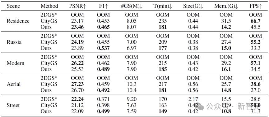 在实验中,相比于已有算法,CityGaussianV2在几何精度(精度P,召回率R,综合指标F1-Score)方面达到了最佳的性能表现。