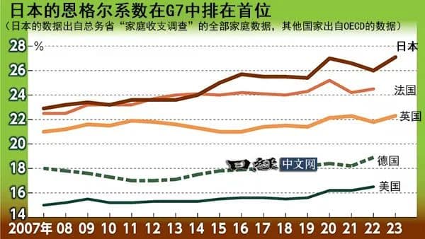 日本的恩格尔系数(食品支出占消费支出的比例)出现高涨,超过了美英德法。美国的恩格尔系数低于20%,但医疗费等负担极为沉重,所以“不能因为(恩格尔系数)处于最高水平就说日本穷”,但从中可以看到女性就业、高龄少子、效率低等种种日本课题……