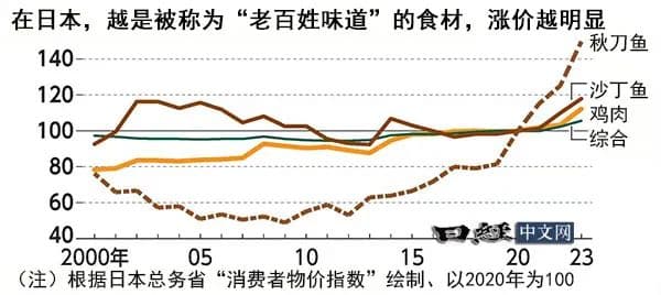 日本存在恩格尔系数容易上升的环境,物价上涨构成直接打击。按物价上涨的比率来看,越是被称为“老百姓味道”的食材,价格上涨得越厉害。根据日本总务省的消费者物价指数(以2020年为100),将2023年的数值与5年前相比,鸡肉上涨12%、沙丁鱼上涨20%、秋刀鱼涨至1.9倍。2024年上半年也延续了同样的涨价趋势。