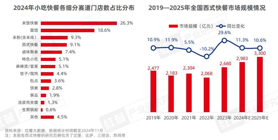 近年来,西式快餐赛道一直保持着较高的增长速度。据红餐产业研究院预测,2024年全国西式快餐市场规模将达到2,983亿元,同比增长11.3%。