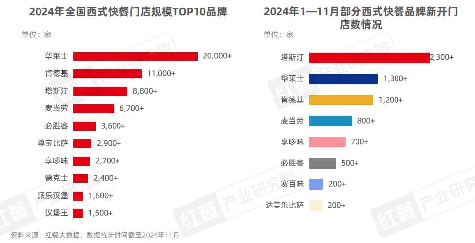红餐大数据显示,截至2024年11月,华莱士的全国门店数超过了2万家;肯德基门店数已有11,000余家;主打中国汉堡的塔斯汀门店数已增至8,800余家,比2023年底增加了2,000余家;麦当劳也加快了拓店速度,目前门店数有6,700余家。