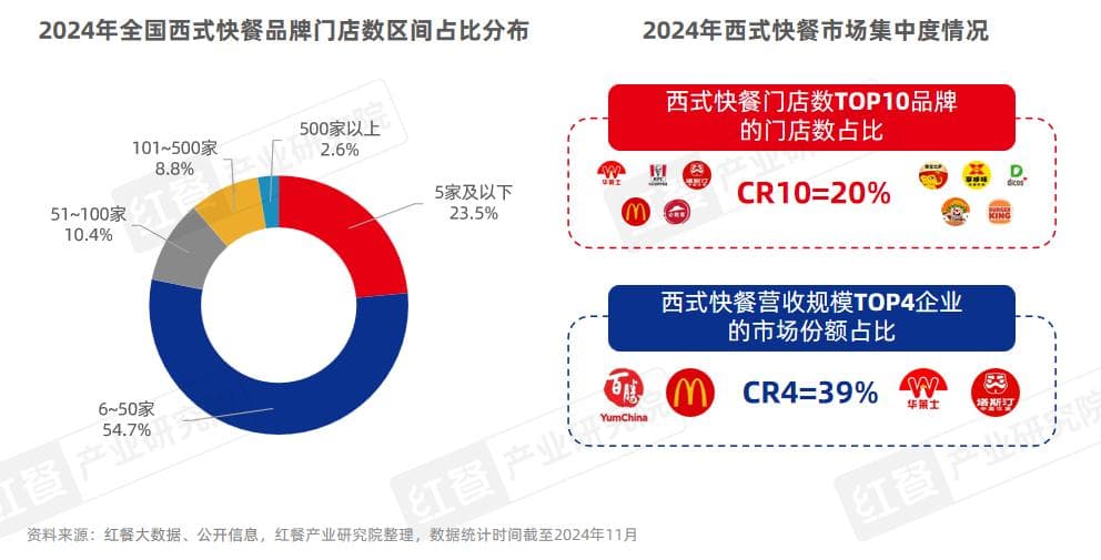 这些西式快餐赛道头部品牌加速拓店的趋势也促使市场集中度进一步提升。红餐大数据显示,西式快餐门店数TOP10品牌占据了全国20%的门店,而西式快餐年度营收规模前四企业占据了全国西式快餐39%的市场份额。