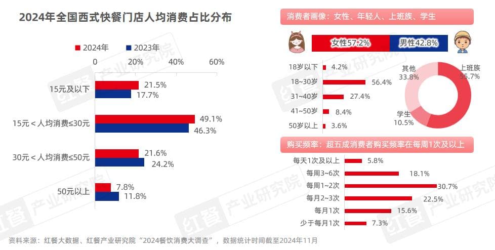 红餐产业研究院“2024餐饮消费大调查”显示,94.2%的受访者表示购买过西式快餐,其中,54.6%的消费者购买频率在每周1次及以上。