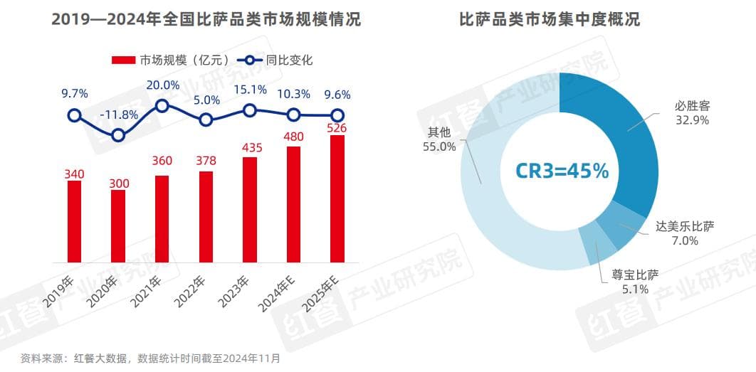 虽然比萨进入我国的时间与汉堡相近,但由于产品定位和用餐场景的不同,其在西式快餐市场的份额占比不到两成。近年来,随着入局者的增多以及比萨品牌的快速扩张,比萨市场持续扩大。红餐大数据显示,2023年全国比萨市场规模为435亿元,同比增长15.1%,预计2024年将进一步增长至480亿元。