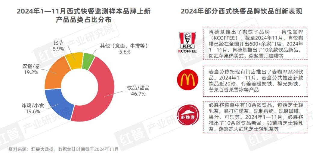 据红餐产业研究统计,2024年1—11月西式快餐监测的样本品牌上新产品中,饮品/甜品的占比最高。肯德基、麦当劳、必胜客等品牌均推出了10余款饮品新品,且这些饮品新品多以现制茶饮和现制咖饮为主,如红苹果热美式、湖盐雪顶咖啡、芒果百香果雪、冰莉芝士轻乳茶等。