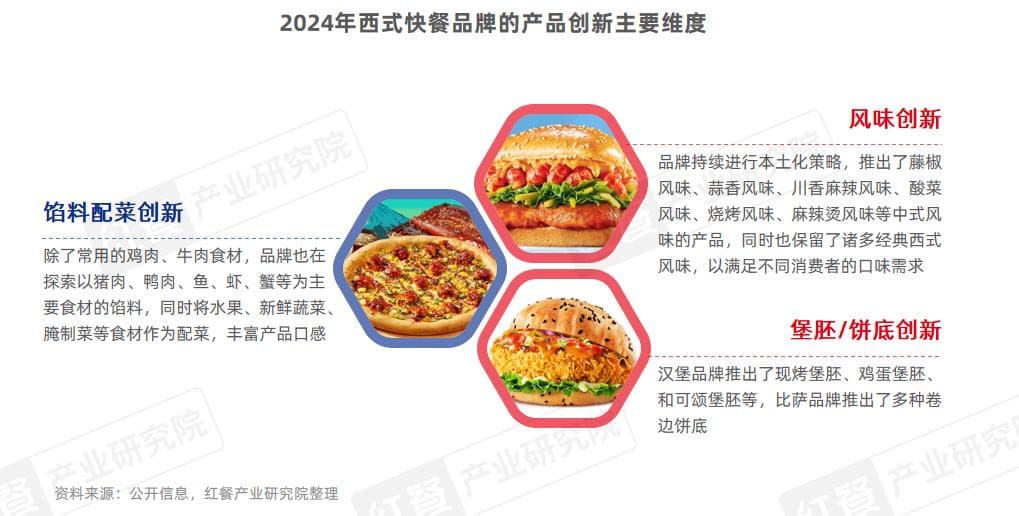 为了在竞争激烈的市场中吸引更多的消费者,西式快餐品牌对其主打产品的创新维度日渐升级,从风味、馅料配菜到堡胚/饼底等方面全方位探索,以寻求差异化。