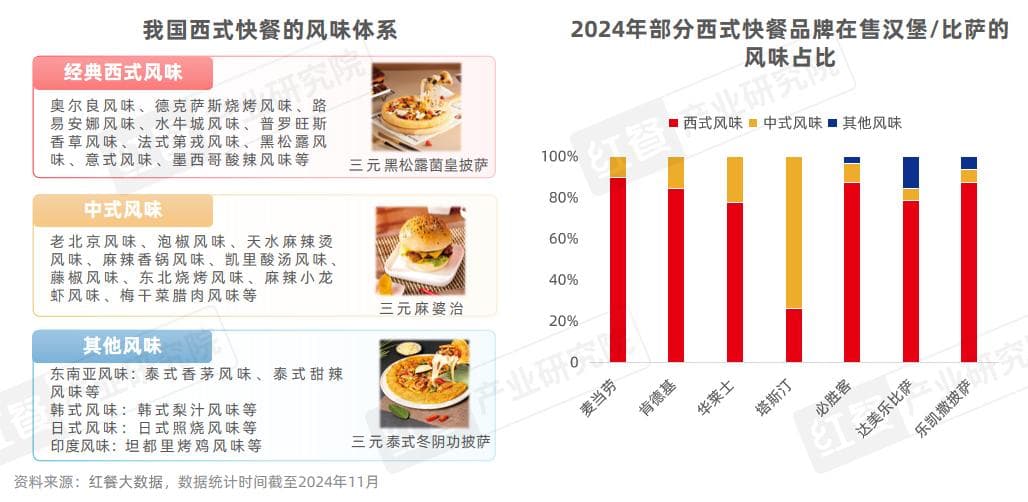 据红餐产业研究院统计,大部分西式快餐品牌的主打产品(汉堡/比萨)仍以经典西式风味为主。与此同时,中式风味的西式快餐产品日渐突出。红餐大数据显示,2024年1—11月,西式快餐监测品牌上新的汉堡/比萨产品中,中式风味占比为26.2%。