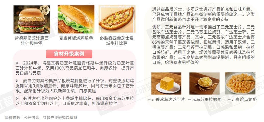 品牌的这些微创新策略也离不开上游企业的支持。例如,三元食品针对这一需求推出了三元芝士片、三元香浓车达芝士片、三元马苏里拉奶酪、车达芝士碎、三元高熔点奶酪等产品。其中,三元香浓车达芝士片含有65%的天然干酪芝香浓郁,细腻柔滑,适用于汉堡、三明治等产品;三元马苏里拉奶酪,口感温和柔韧,拉丝口感较好,适用于比萨、焗饭等需要兼具奶香味及拉丝效果的产品;三元高熔点奶酪耐高温烘烤,具有咀嚼的口感。