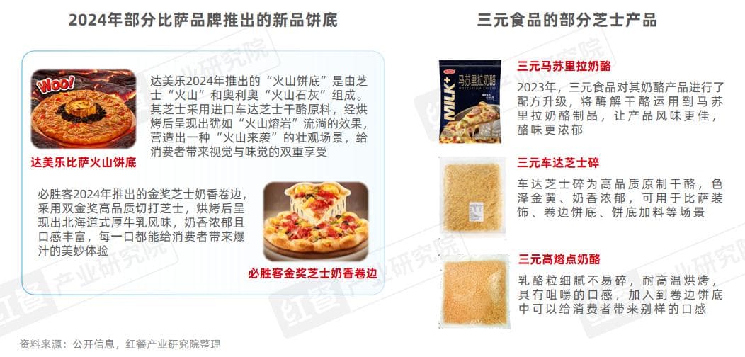 红餐产业研究院观察,近年来,芝士是比萨品牌创新饼底的重要食材。例如,必胜客和尊宝比萨在2024年推出的3款新卷边饼底中,有两款含有芝士;达美乐新推出的“火山饼底”是由芝士“火山”和奥利奥“火山石灰”组成,营造出一种“火山来袭”的壮观场景,给消费者带来视觉与味觉的双重享受。