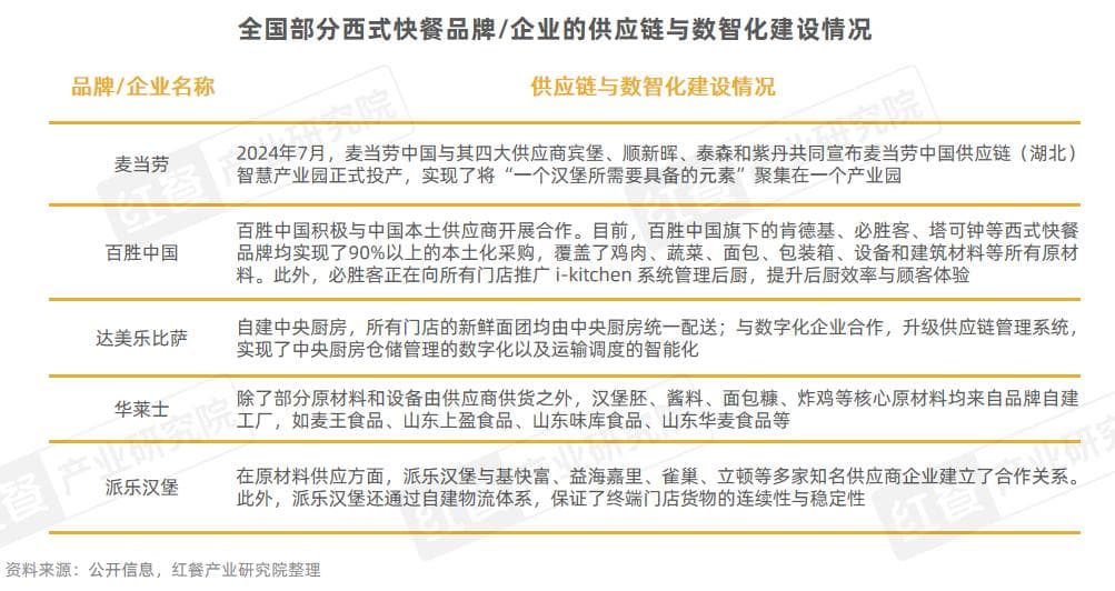 在人均消费下滑的背景下,精细化运营成为众多西式快餐品牌/企业降本增效的重要战略手段。从本土化采购到自建中央厨房与加工厂,再到自建物流配送体系,以及引入数字化工具和智能化设备,西式快餐品牌正在向餐饮供应链条中的每一环节寻找最优的降本增效方案。