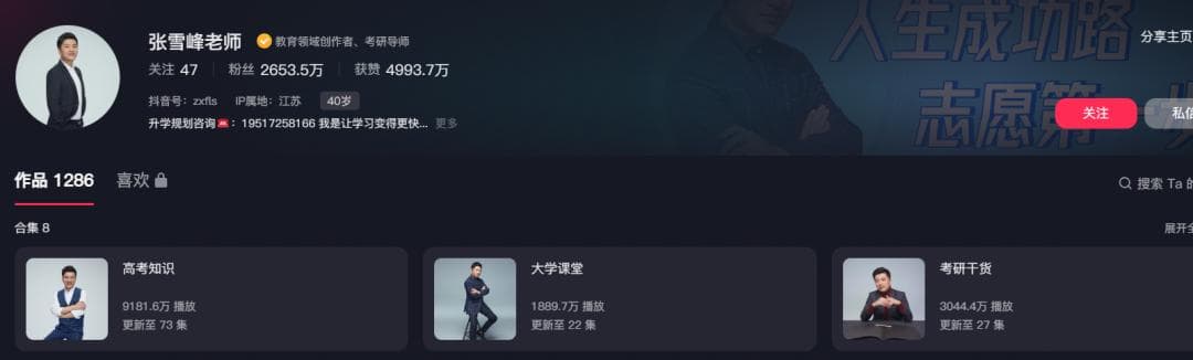 当下教培行业正在发生巨变,教培机构 MCN 化是一种行业发展趋势。 最有代表性的人物是提供考研咨询服务的老师张雪峰 ,他站在风口浪尖,过去一年涨粉超 1240 万,位列抖音年度涨粉榜第 8 名。变现能力更夸张,号称“讲课能赚几百万,公司上市变现能挣几亿”。