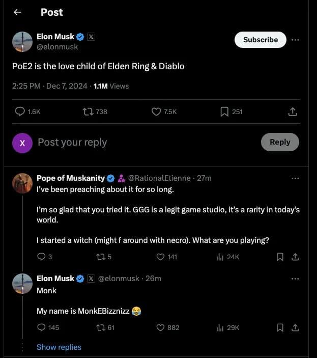 就拿Steam热销榜来说,近期《三角洲行动》《漫威争锋》都拿到了不错的成绩,而腾讯的《流放之路2》更是号称年末最后的大黑马,Steam最高同时在线峰值接近58万人,冲进历史Top15,并在热销榜Top1的位置上呆了五天。就连埃隆·马斯克都是第一时间游玩,并表示该游戏是“艾尔登法环+暗黑的结晶”。