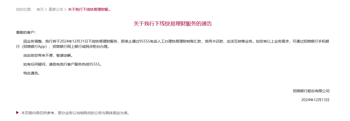 12月13日,招商银行在官网发文称,将于2024年12月31日下线快易理财服务,即停止通过95555电话人工办理快易理财转账汇款、信用卡还款、定活互转等业务。财联社记者注意到,此前已经有国有大行中止过此类通过电话人工方式进行远程交易的服务。