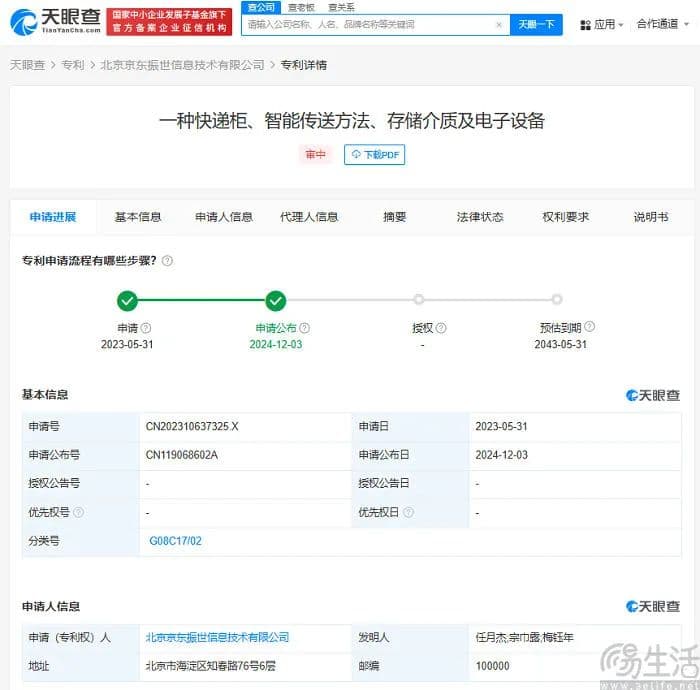 具体而言,2023年5月北京京东振世信息技术有限公司申请了一项名为“一种快递柜、智能传送方法、存储介质及电子设备”的专利,公开号为CN119068602A。专利摘要中显示,其能够提高快递柜的存取包裹的效率,以及提高操作人存取包裹的体验。
